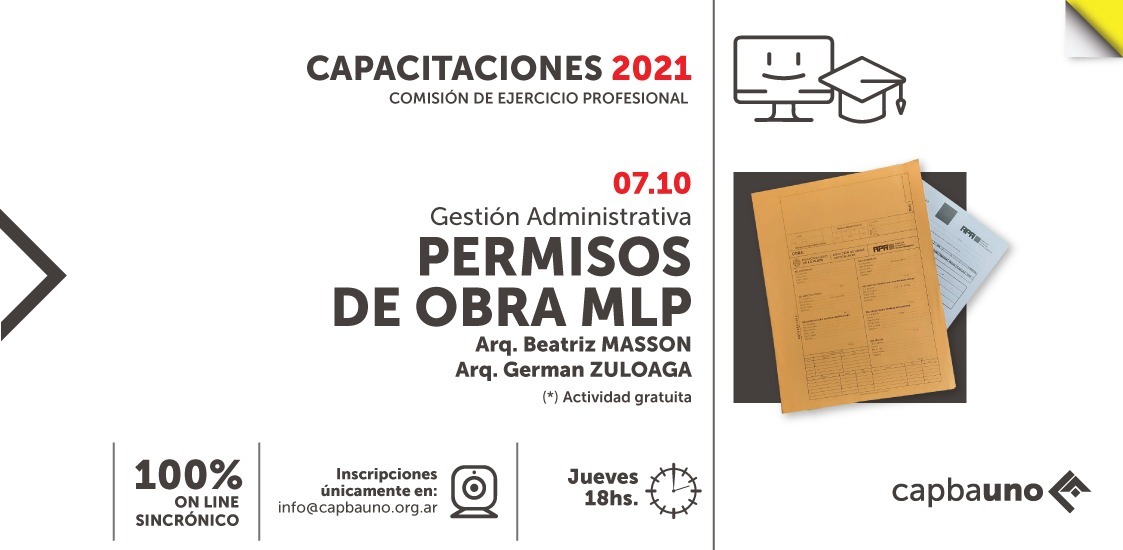 El próximo jueves 7 de octubre, desde las 18 hs se desarrollará una capacitación a cargo de la Arq. Beatriz Masson y el Arq. Germán Zuloaga, que tiene por objetivo brindar herramientas –fundamentalmente a los matriculados recientes- para efectuar las tramitaciones conducentes a la obtención de permisos de obra en el Municipio de La Plata.