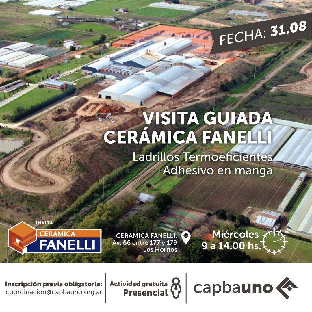 El miércoles 31 de agosto, el CAPBAUNO conjuntamente con la empresa Fanelli, organizan una visita guiada a la planta fabril y una charla técnica, donde será posible conocer el proceso de producción y la tecnología empleada para la fabricación de ladrillos cerámicos.
