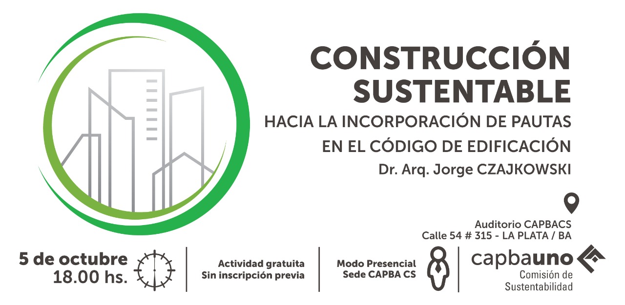 En el marco de las actividades de la Comisión de Sustentabilidad del CAPBAUNO, el miércoles 5/10 a las 18 hs en el CAPBA CS, se desarrollará una charla de acceso libre y gratuito sobre “Construcción Sustentable/ Hacia la incorporación de Pautas en el Código de Edificación”, que fuera oportunamente anunciada y postergada por razones de fuerza mayor.