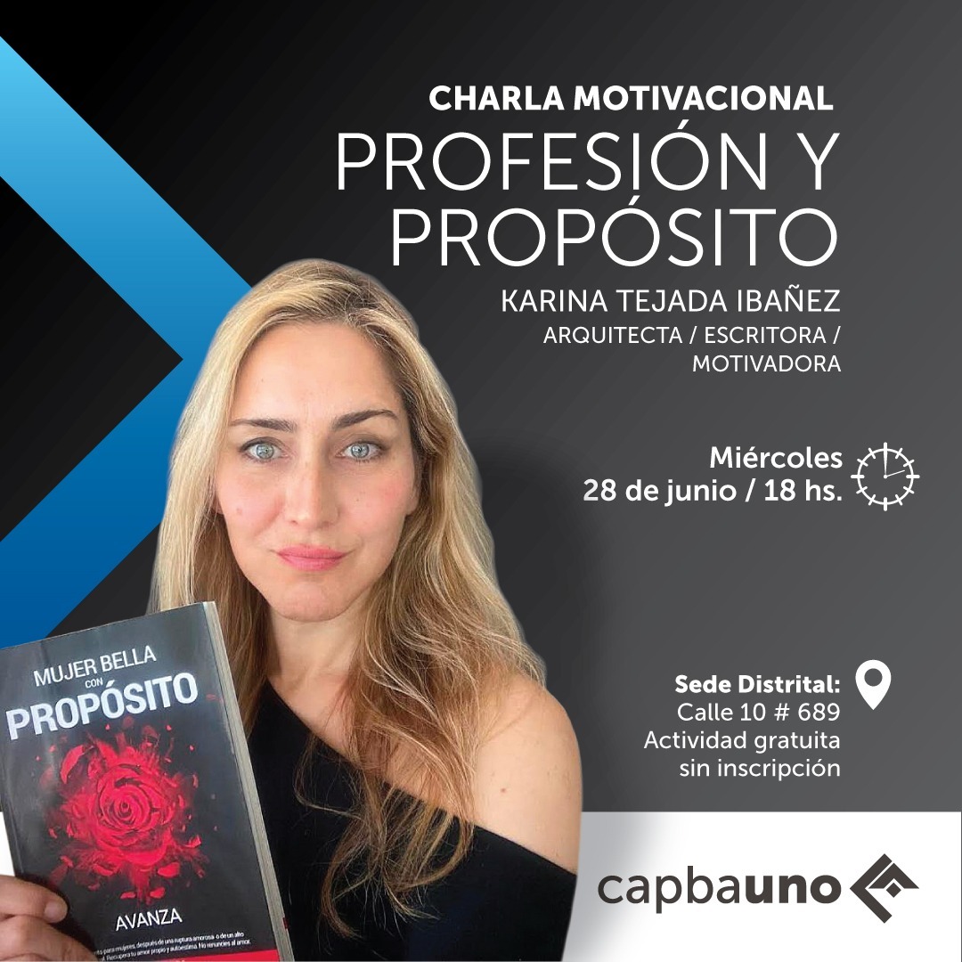 El miércoles 28/6 a las 18 hs en la Sede Distrital, la escritora, motivadora, arquitecta y creadora de contenido para el bienestar Karina Tejada, ofrecerá una charla motivacional para las colegas, orientada a llevar su profesión a un alto nivel.