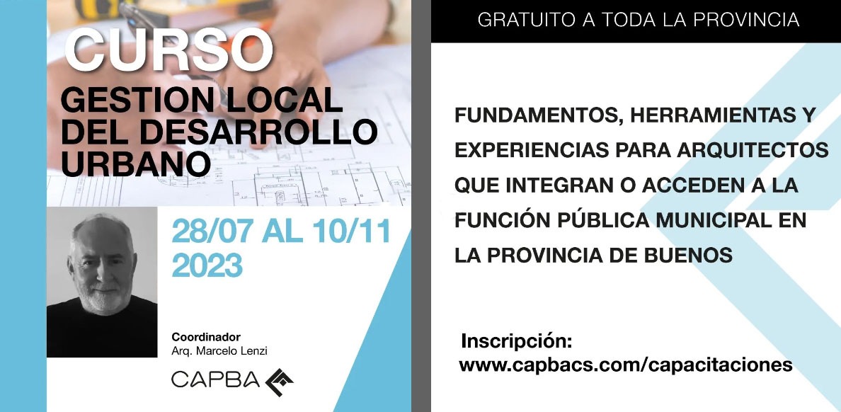 En el marco de las capacitaciones gratuitas del Consejo Superior del CAPBA -accesibles a toda la matrícula-, el viernes 28 de julio comienza el curso “Gestión Local del Desarrollo Urbano”, destinado a arquitectos que integran equipos técnicos o de responsabilidad política en los municipios, así como a los que poseen interés o en esos roles, que requieran capacitarse en las lógicas políticas, jurídicas e institucionales que enmarcan la gestión pública.