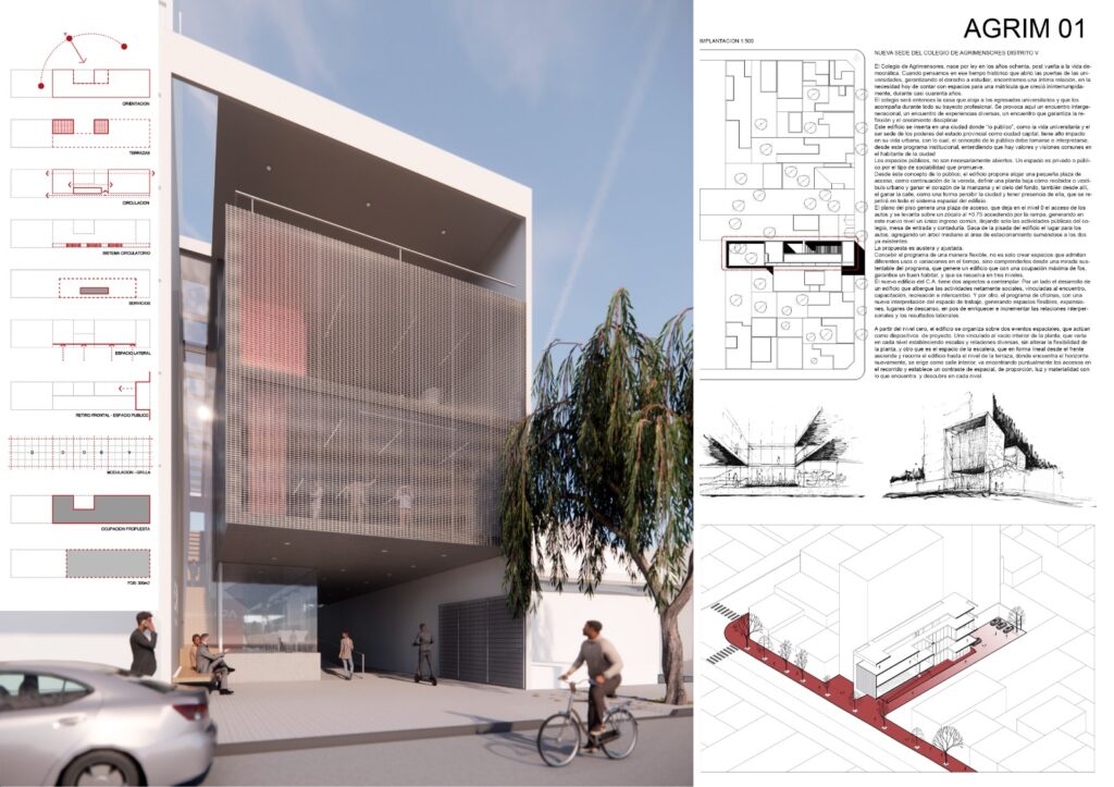 El jueves 6/7, se conocieron los trabajos premiados en el Concurso Provincial promovido por el Colegio de Agrimensores DV, que tuvo por objetivo obtener un anteproyecto para su nueva sede, caracterizado por una escala acotada para albergar las actividades administrativas actuales y un crecimiento, sumado a un SUM / Auditorio y espacios de encuentro.