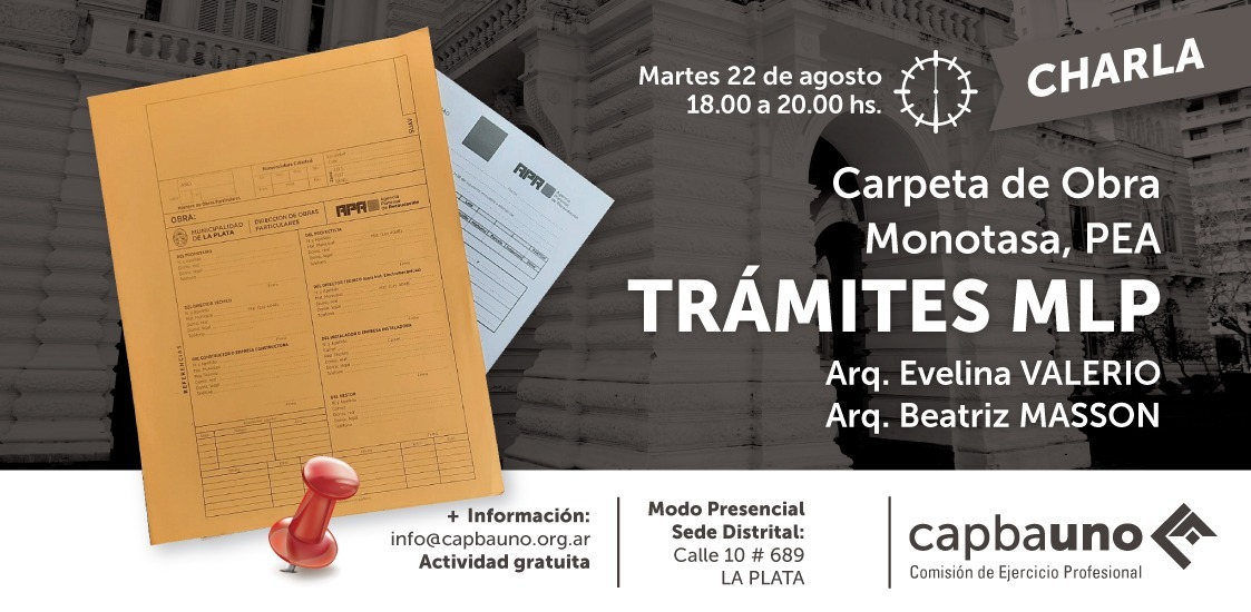 El martes 22/8 a las 18 hs en la Sede Distrital, organizada por la Comisión de Ejercicio Profesional del CAPBAUNO y a cargo de las Arqs. Beatriz Masson y Evelina Valerio, tendrá lugar una charla explicativa sobre los procesos para la tramitación de expedientes de obra en el Municipio de La Plata.