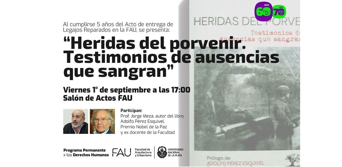 Al cumplirse cinco años del Acto de entrega de legajos reparados de las víctimas del terrorismo de Estado (1975/83), la Facultad de Arquitectura y Urbanismo de la UNLP invita a la comunidad a la presentación del libro “Heridas del porvenir. Testimonios de ausencias que sangran”.