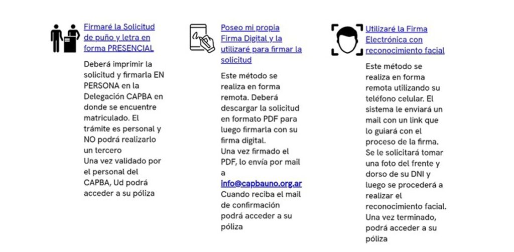 Con este documento impreso, deberá concurrir personalmente a cualquiera de las sedes del CAPBAUNO, donde firmará y entregará el mismo frente a personal o autoridad distrital, que se encargará de verificar la identidad y anexar la documentación escaneada al legajo del profesional. A partir de allí, podrá tenerse acceso a la póliza desde la autogestión del Capba en línea.