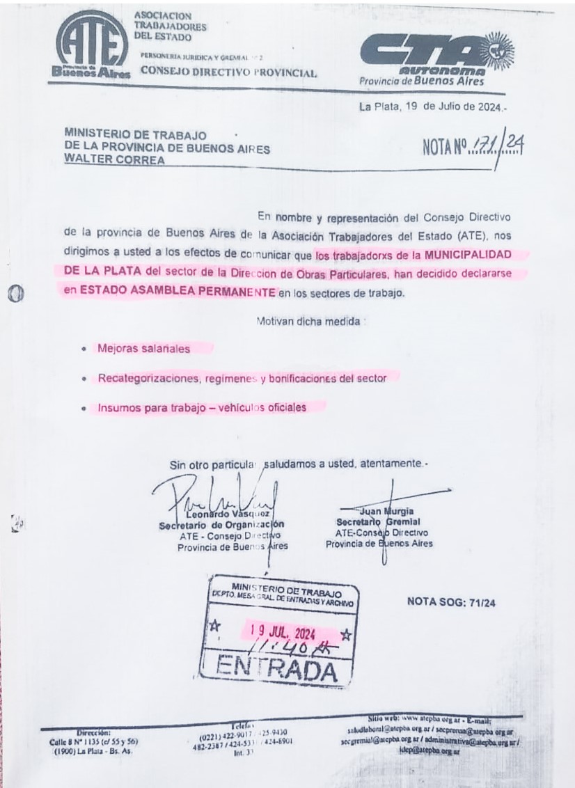 Informamos a la matricula, que la atención en la Dirección de Obras particulares de la Municipalidad de La Plata, está viéndose temporalmente afectada por una medida gremial de los trabajadores del área. Los mismos se declararon en Asamblea Permanente, habiéndole elevado al ejecutivo un reclamo por mejoras salariales, re categorizaciones e insumos para el trabajo.