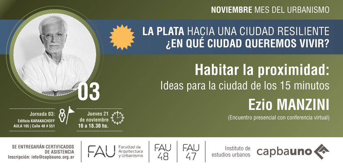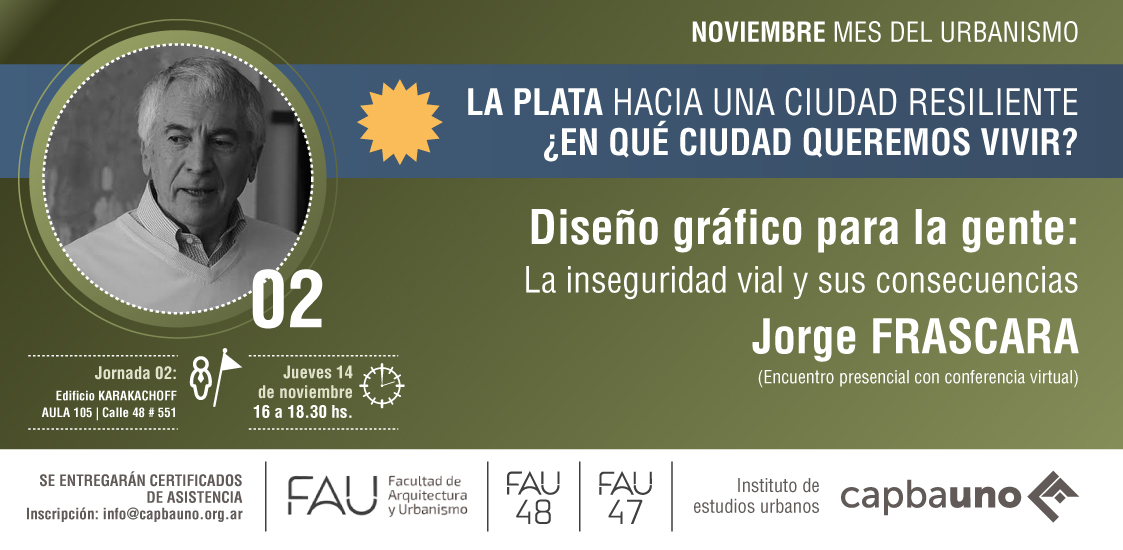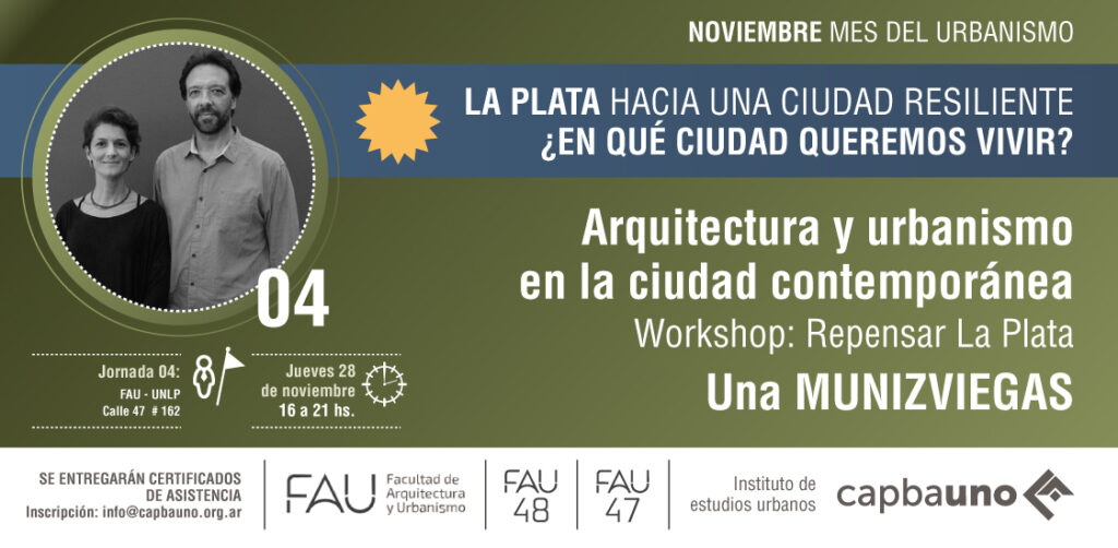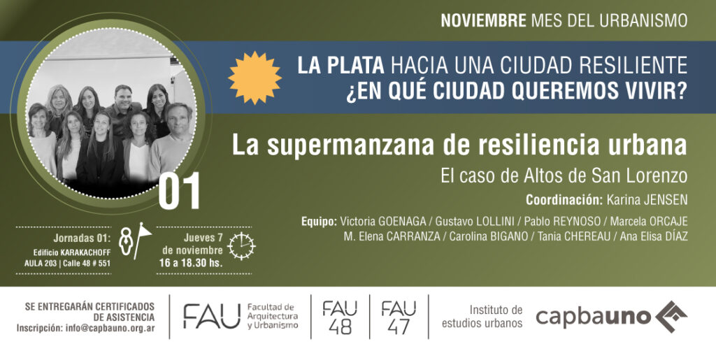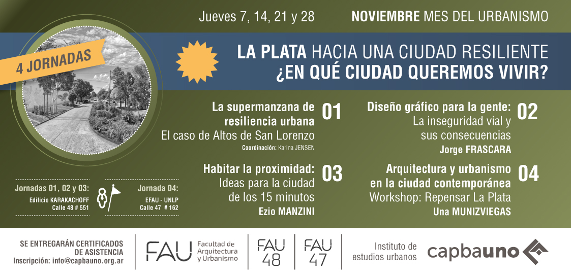 En el marco de la celebración el 8/11 del 75° aniversario del Día del Urbanismo –instituido por la Organización de Naciones Unidas, desde el IEU -Instituto de Estudios Urbanos- del CAPBAUNO, se propuso al próximo noviembre como Mes del Urbanismo, y para ello se desarrollará el ciclo ¿EN QUÉ CIUDAD QUEREMOS VIVIR? / LA PLATA HACIA UNA CIUDAD RESILIENTE, en los espacios físicos FAU48 (Edificio Karakachoff) y FAU47.