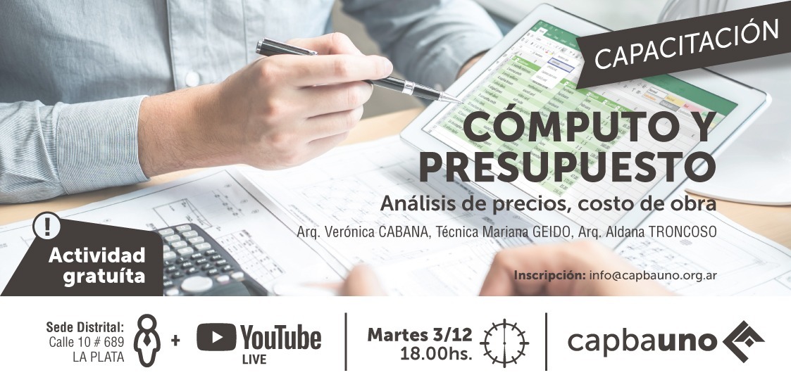 El martes 3 de diciembre a las 18 hs, se realizará una capacitación gratuita en Cómputo y Presupuesto en modalidad híbrida, se podrá presenciar en la Sede Distrital -calle 10 n° 689- y por Youtube live del CAPBAUNO.