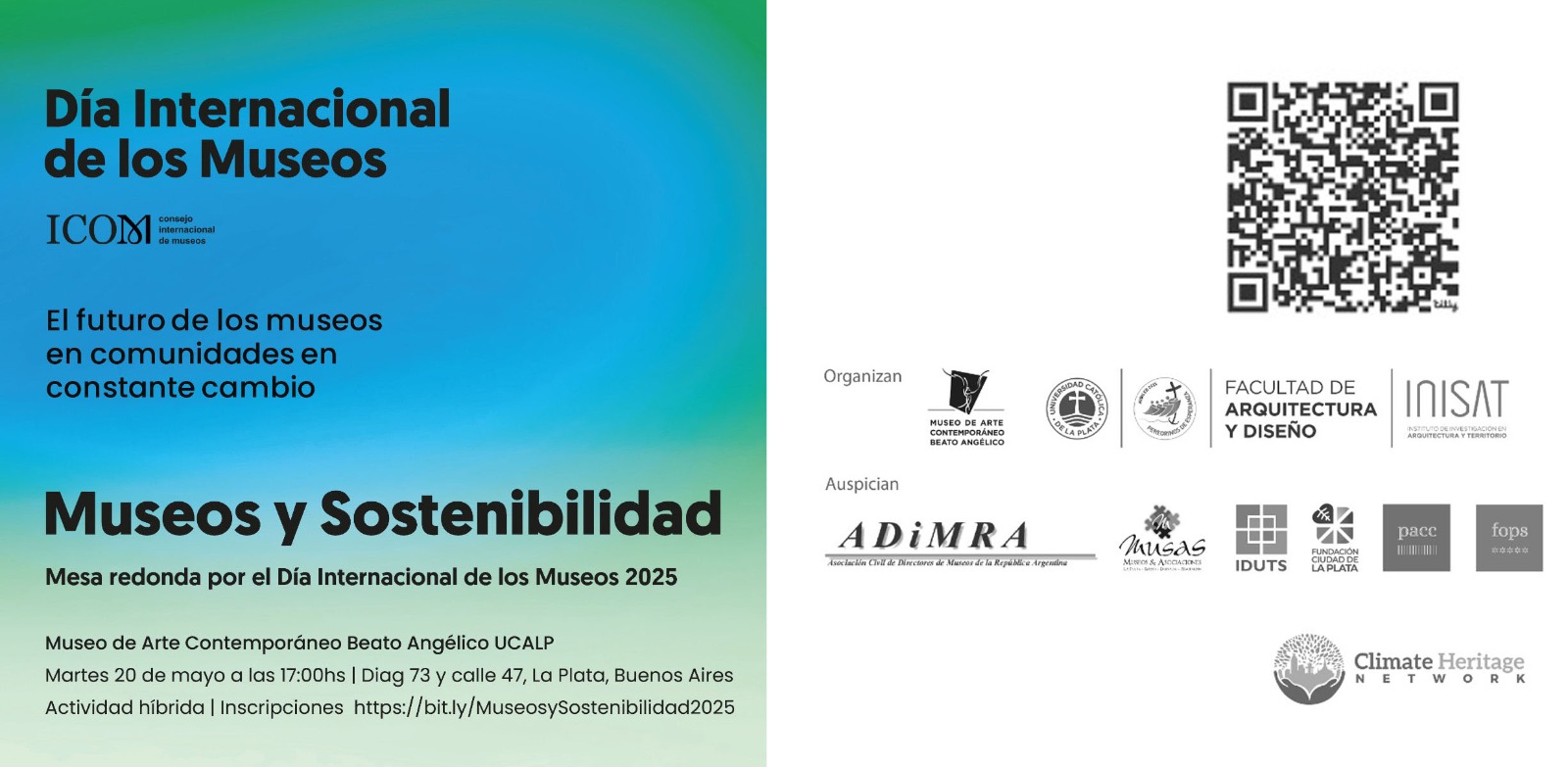 Organizada por el Museo de Arte Contemporáneo Beato Angélico y el Instituto de Investigación en Arquitectura y Territorio de la Facultad de Arquitectura y Diseño de la UCALP, el martes 20/5 a las 17 hs tendrá lugar una mesa redonda bajo el lema “Museos y Sostenibilidad / El futuro de los museos en comunidades en constante cambio», en el marco de la celebración del “Día Internacional de los Museos”.