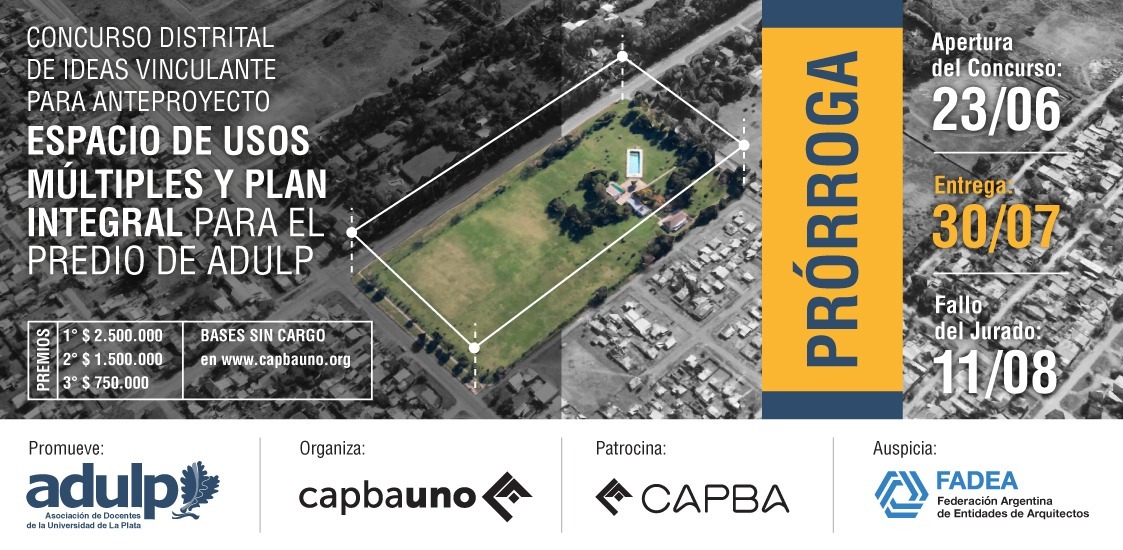 Promovido por A.D.U.L.P. (Asociación Docentes Universidad de La Plata) y organizado por el CAPBAUNO Colegio de Arquitectos de la Provincia de Buenos Aires Distrito I, busca propuestas que contemplen un esquema general de Plan Integral y sectores para el predio de ADULP “Nuevo Campito”, ubicado Av. 32 entre 153 y 155 de la ciudad de La Plata y que fuera antiguamente propiedad del CAPBAUNO.