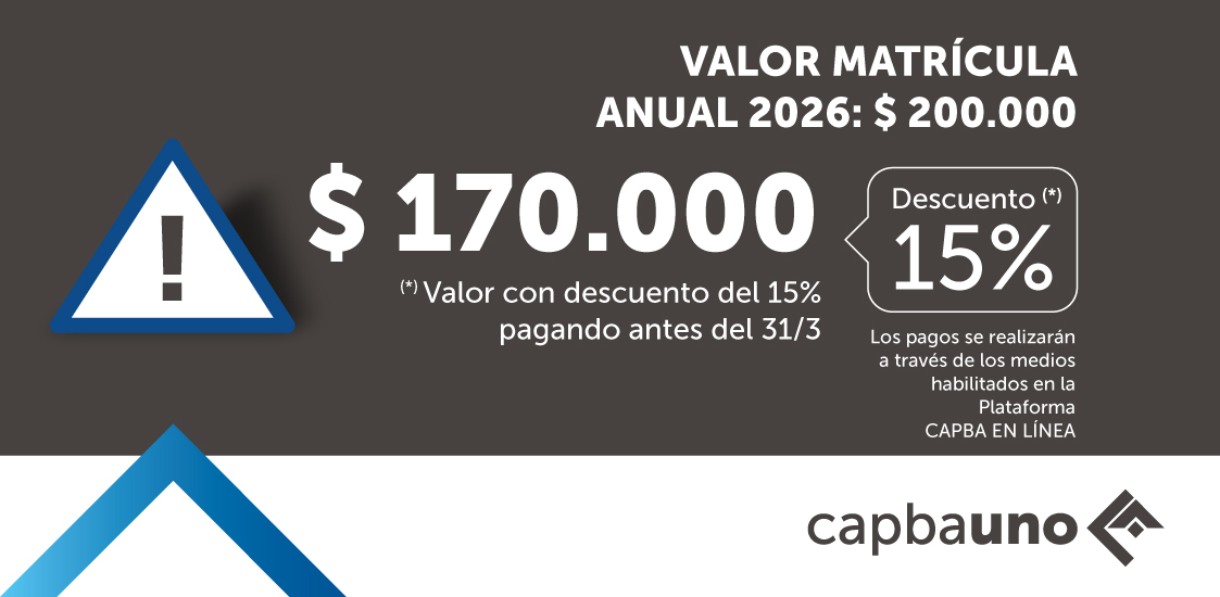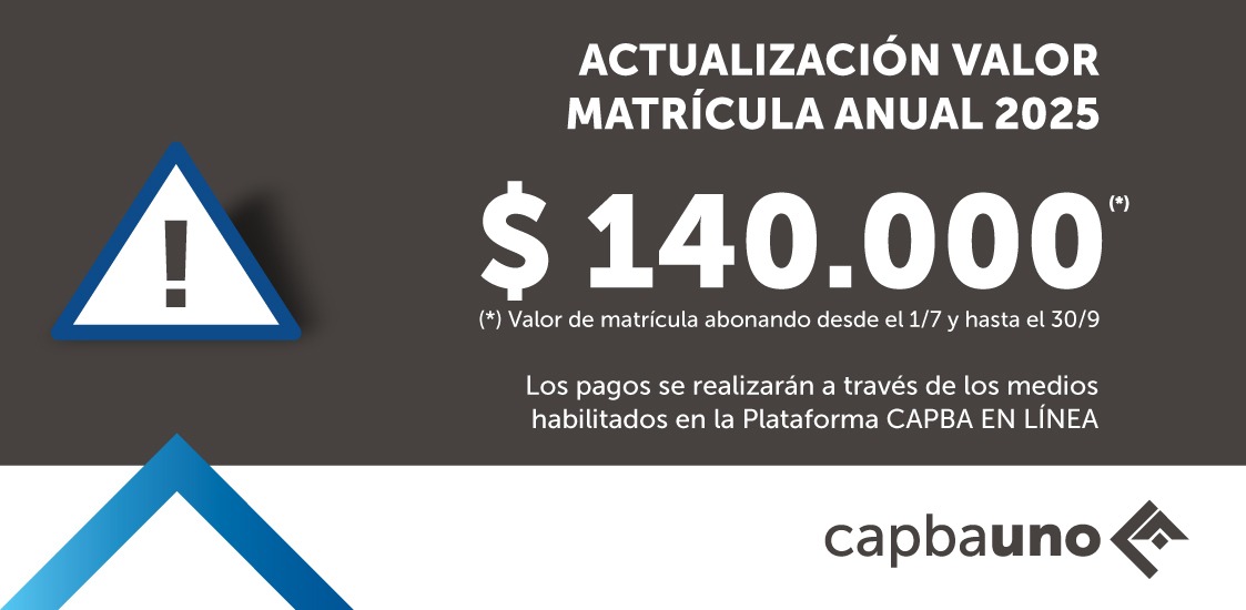 Recordamos a los profesionales, que por Resolución del Consejo Superior del CAPBA, desde 2023 la matrícula se cancela en un pago único -no fraccionada en trimestres-, y su valor desde el 1° de julio hasta el 30 de septiembre será de $140.000 y desde el 1° de octubre hasta el 31 de diciembre será de $155.000.