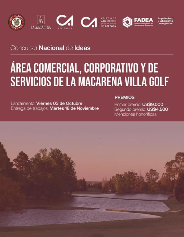 Río Cuarto Golf Club, en calidad de entidad promotora del presente llamado, y el Colegio de Arquitectos de la Provincia de Córdoba y la Regional 4 Sur del Colegio de Arquitectos de la Provincia de Córdoba, en carácter de entidades organizadoras, lanzaron el “CONCURSO NACIONAL de IDEAS ÁREA COMERCIAL, CORPORATIVA Y DE SERVICOS “LA MACARENA” – RIO CUARTO GOLF CLUB”.
