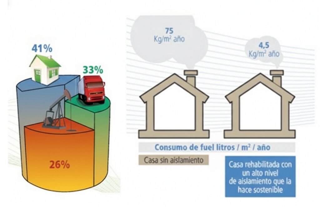 La demanda de energía por parte de los edificios, representan el 50 % del consumo energético en EE.UU., el 35 % en la Unión Europea y el 27 % en Latinoamérica -encontrándose nuestro País dentro de la media del continente-, con el agravante que en un 90 % se depende para la generación de combustibles fósiles, que están en un sostenido camino de agotamiento.