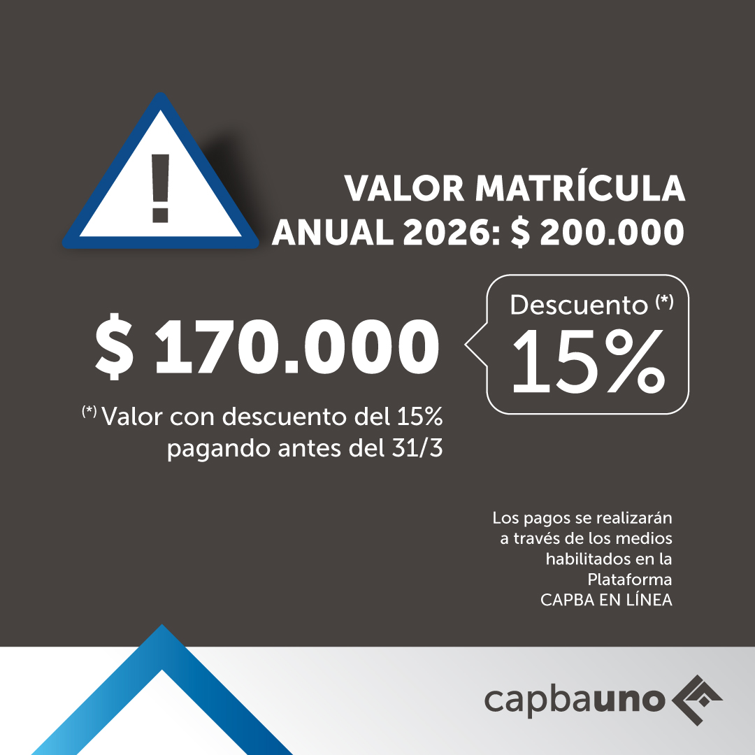La Asamblea Anual Ordinaria del CS del CAPBA, estableció que la matricula anual para el año 2026, tendrá un valor hasta el 30 de junio del corriente de $200.000 (doscientos mil).