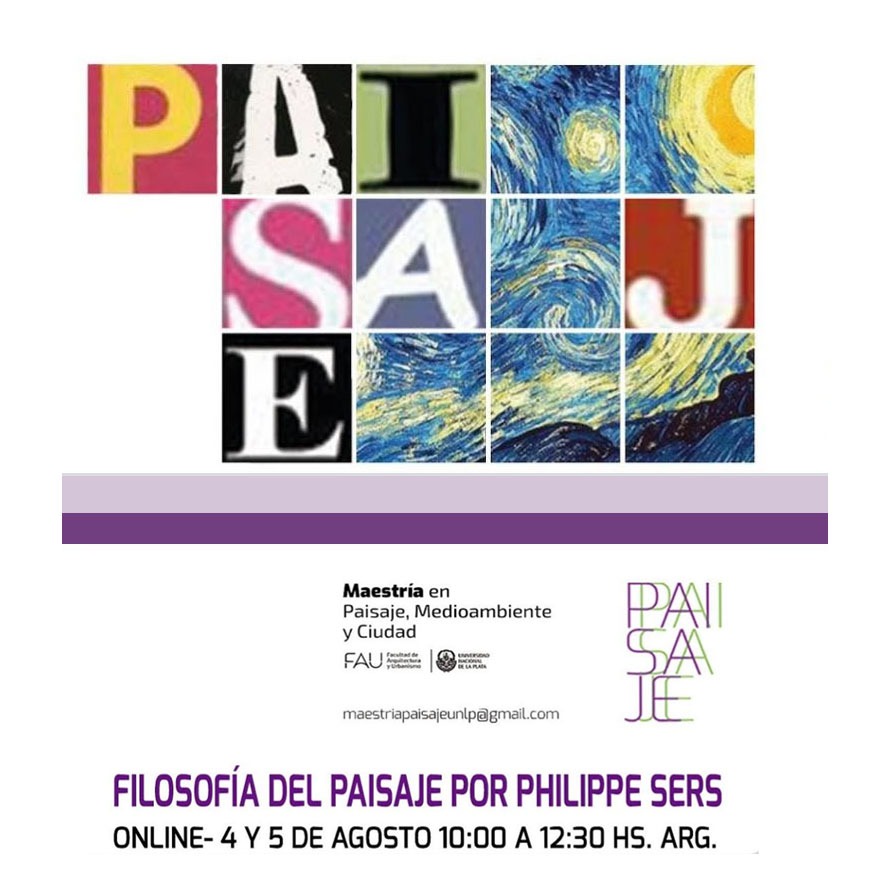 En el marco de las actividades complementarias de la Maestría en Paisaje, Medioambiente y Ciudad de la FAU-UNLP, el 4 y 5 de agosto a las 12:30 hs (ARG), se desarrollará la conferencia “Filosofía del Paisaje”, a cargo del Dr. Philippe Sers (Francia).