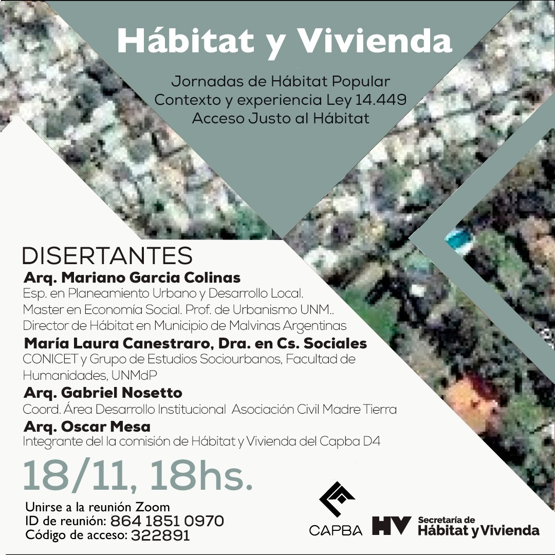 El jueves 18/11 a las 18 hs por plataforma ZOOM, comienza un nuevo ciclo organizado por la Secretaria de Hábitat y Vivienda del CAPBA CS, orientado nuevamente a visibilizar el trabajo de arquitectos y arquitectas en el hábitat popular, en el marco de la Ley 14.449 de Acceso Justo al