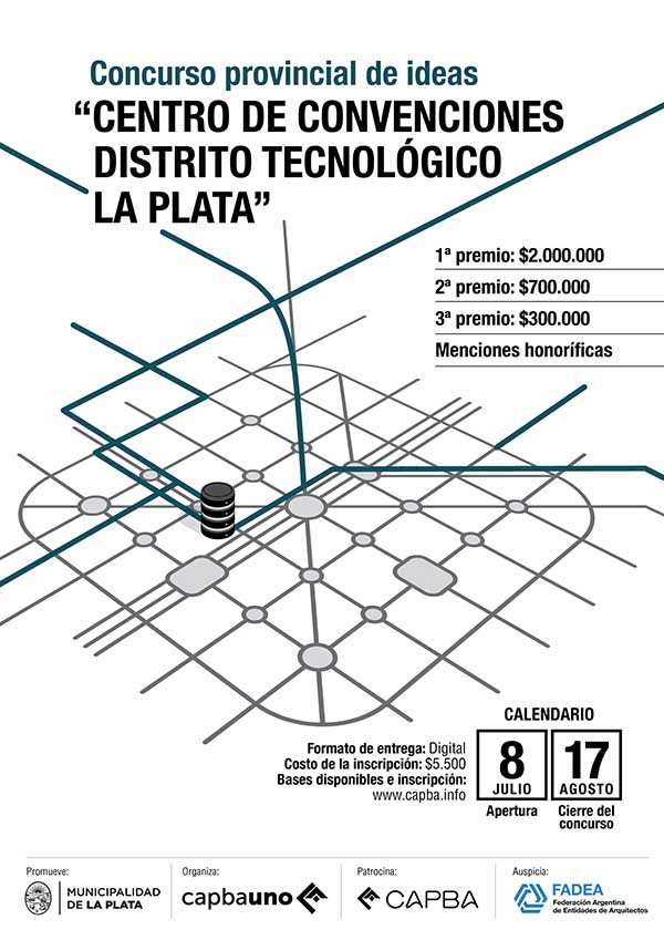 La Municipalidad de La Plata y el Colegio de Arquitectos de la Provincia de Buenos Aires Distrito I, convocan a un CONCURSO PROVINCIAL DE IDEAS PARA EL “CENTRO DE CONVENCIONES DISTRITO TECNOLÓGICO LA PLATA”, a emplazarse en la manzana comprendida