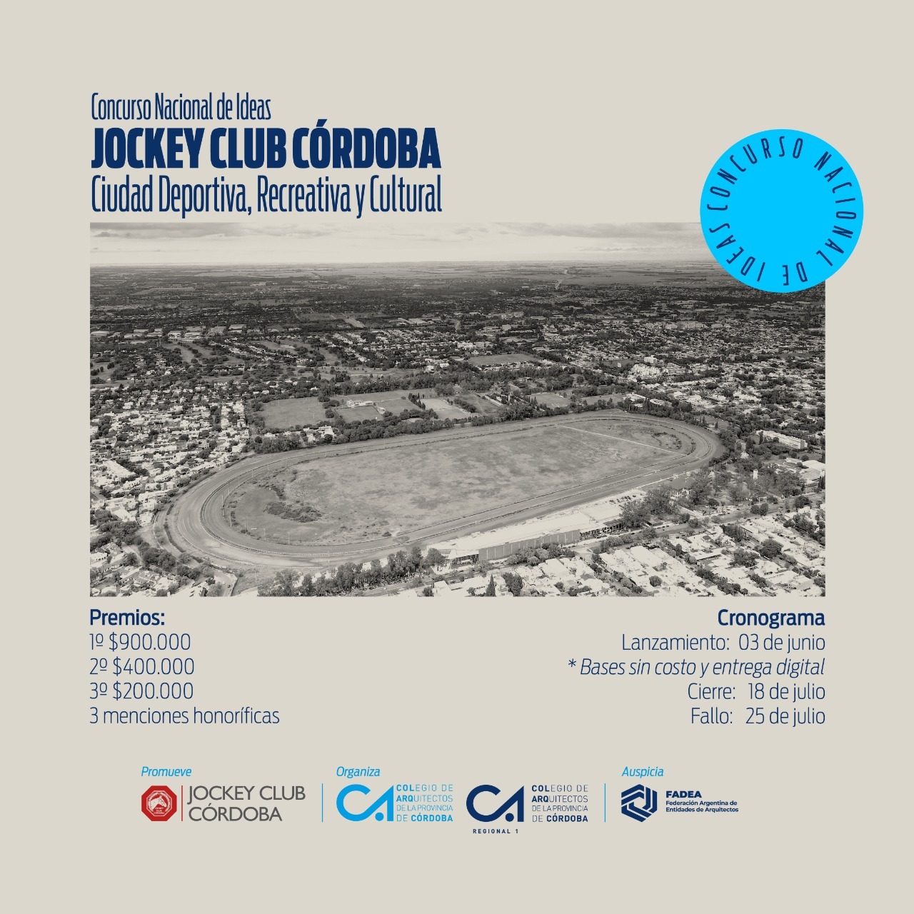 El Jockey Club Córdoba, en calidad de entidad promotora del presente llamado, y el Colegio de Arquitectos de la Provincia de Córdoba, en carácter de entidad organizadora, llaman al Concurso Nacional de Ideas “JOCKEY CLUB CÓRDOBA. Ciudad Deportiva, Recreativa y