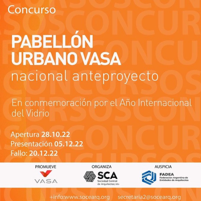 Vidrieria Argentina SA, (VASA) promotora del presente llamado, encarga a la Sociedad Central de Arquitectos (SCA) la organización, realización y difusión de un “CONCURSO NACIONAL DE ANTEPROYECTO PABELLÓN URBANO VASA”, con el auspicio de la Federación Argentina de Entidades de