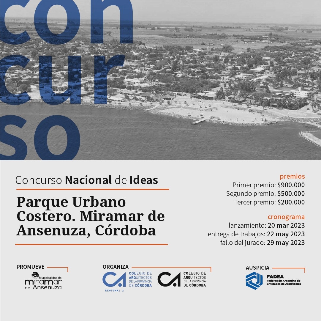 La Municipalidad de Miramar de Ansenuza, en calidad de entidad promotora del presente llamado, y el Colegio de Arquitectos de la Provincia de Córdoba, en carácter de entidad organizadora, llaman a “CONCURSO NACIONAL DE IDEAS PARQUE URBANO COSTANERO DEL BARRIO