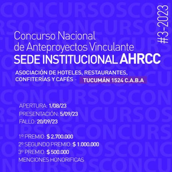 LA ASOCIACIÓN DE HOTELES, RESTAURANTES, CONFITERÍAS Y CAFÉS, a través de su consejo directivo, encargó a la Sociedad Central de Arquitectos (SCA) la organización, realización y difusión de un Concurso Nacional de Anteproyectos Vinculante denominado Sede Institucional AHRCC, Tucumán 1524,