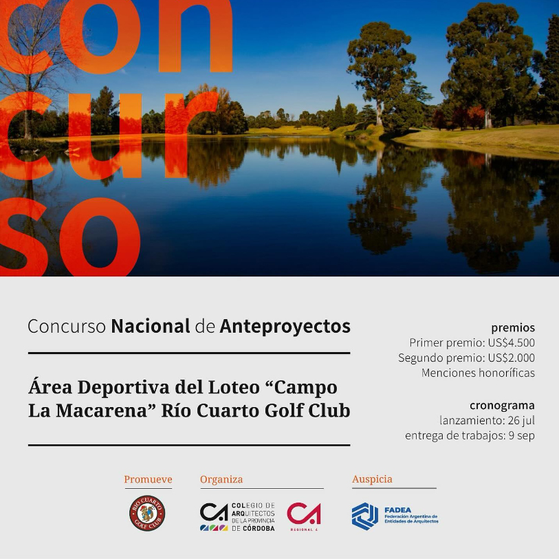 Promovido por el Rio Cuarto Golf Club y organizado por el Colegio de Arquitectos de Córdoba Regional 4 con alcance nacional, tiene por objeto seleccionar una propuesta arquitectónica-paisajística para el desarrollo del área deportiva en el Loteo La Macarena perteneciente