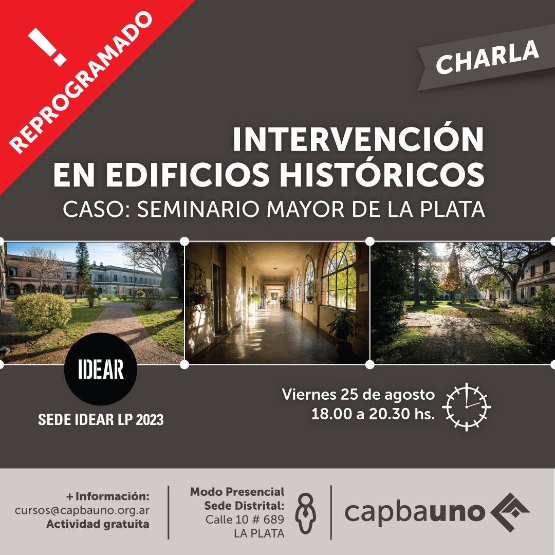 La Comisión de Patrimonio y Paisaje del CAPBAUNO, invita a la matrícula y al público en general, a participar de la charla “Intervención en edificios históricos” focalizada en el caso del Seminario Mayor de La Plata -calle 24 entre 65 y 66-.