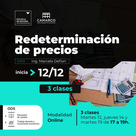 La Escuela de Gestión de la Construcción de la Cámara Argentina de la Construcción -CAMARCO-, lanzó una nueva capacitación, que tiene por objetivo abordar la metodología de re determinación de precios en la Obra Pública por el decreto 691/2016, sus modificaciones y aplicaciones prácticas.