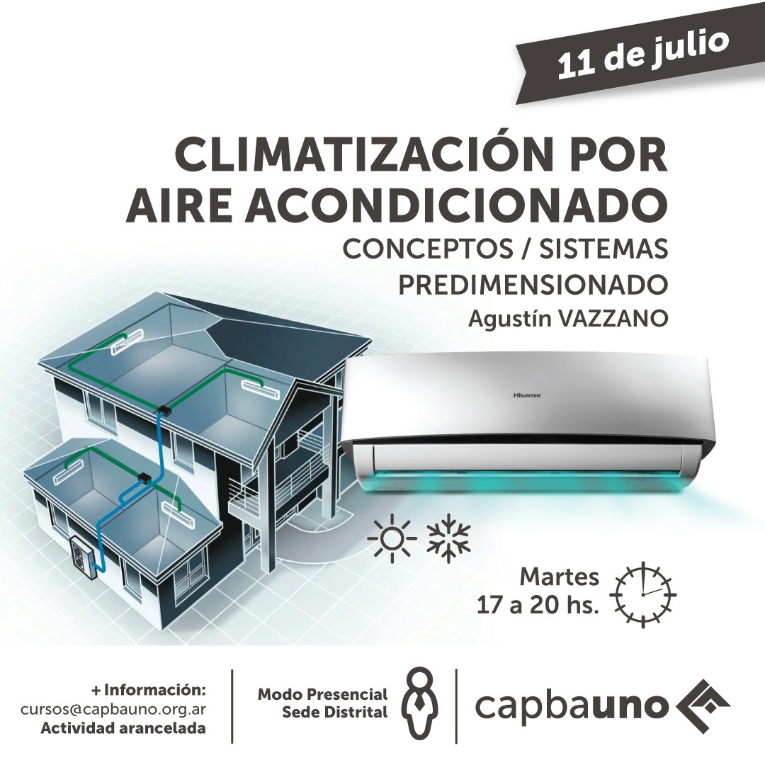 El martes 11 de julio a las 17 hs en la Sede Distrital, se desarrollará una capacitación arancelada en “Climatización por Aire Acondicionado”, a cargo del Técnico Instalador Agustín Vazzano.
