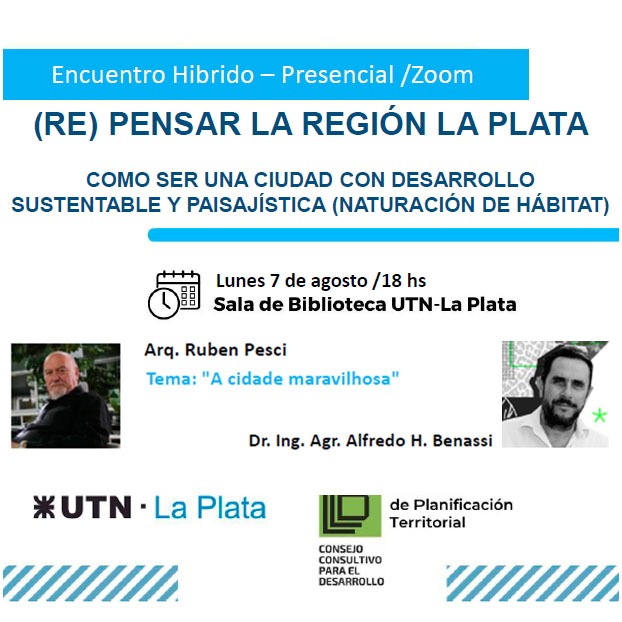 El lunes 7/8 desde las 18 hs, en la Biblioteca de la sede de la UTN -Universidad Tecnológica Nacional- de La Plata (Av. del Petróleo Argentino 417 Berisso), se llevará a cabo un nuevo encuentro hibrido -presencial/virtual-, del ciclo “(RE)PENSAR LA REGION LA PLATA”, organizado por la Comisión de Planificación Territorial