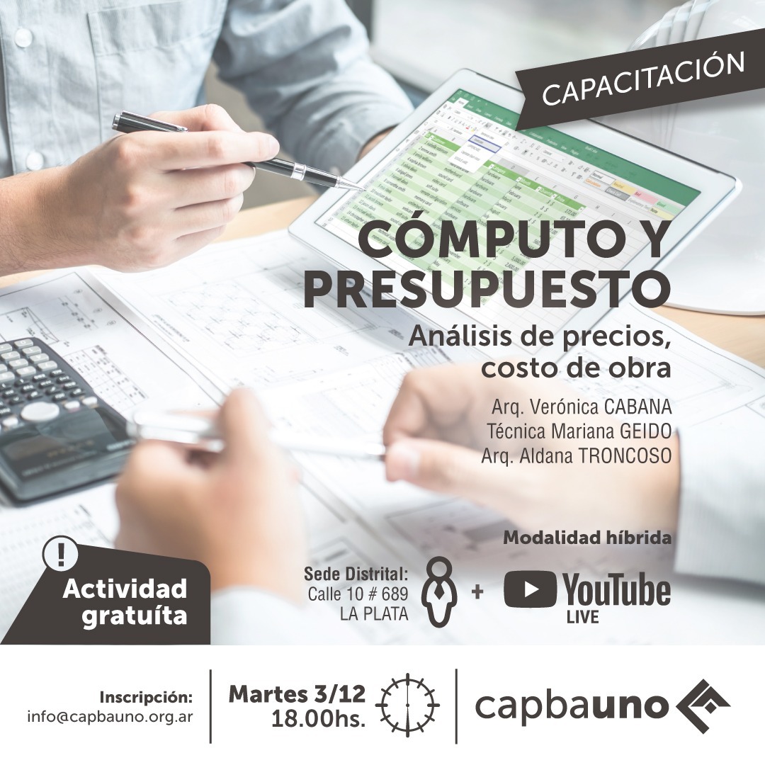 El martes 3 de diciembre a las 18 hs, se realizará una capacitación gratuita en Cómputo y Presupuesto en modalidad híbrida, se podrá presenciar en la Sede Distrital -calle 10 n° 689- y por Youtube live del CAPBAUNO.