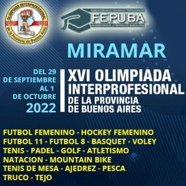 La Federación de Entidades de Profesionales Universitarios de la Provincia de Buenos Aires, anunció la celebración de la XVI Olimpiada Interprofesional, que tendrá lugar entre el 29 de septiembre y el 1 de octubre del corriente en la ciudad de Miramar.