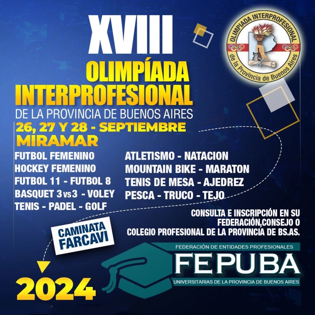 El 28, 29 y 30 de septiembre se llevará adelante en la Ciudad de Miramar, la XVII Olimpíada Interprofesional, organizada por FEPUBA -Federación de Entidades Profesionales Universitarias de la Provincia de Buenos Aires-.