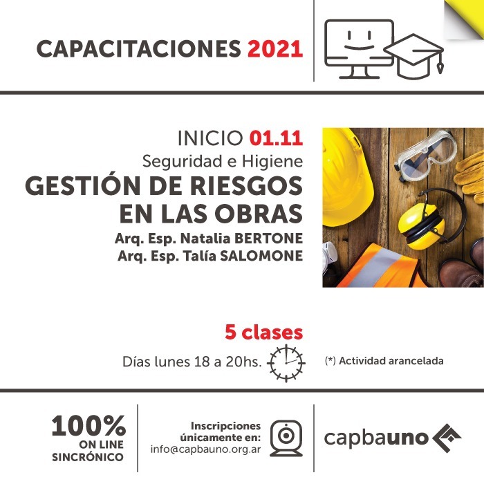 El lunes 1 de noviembre comienza el curso “Gestión de Riesgo en las Obras”, a cargo de Natalia BERTONE y Talia SALOMONE, Arqs. Especialistas en Higiene y Seguridad en la Industria de la Construcción FAU – UNLP.