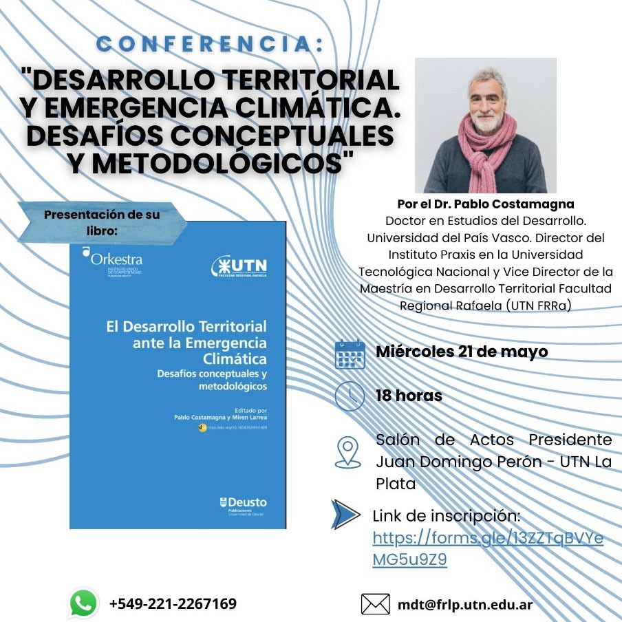 El día miércoles 21/5 a las 18 hs se desarrollará la conferencia titulada "Desarrollo Territorial y Emergencia Climática. Desafíos conceptuales y metodológicos", a cargo del Dr. Pablo Costamagna.