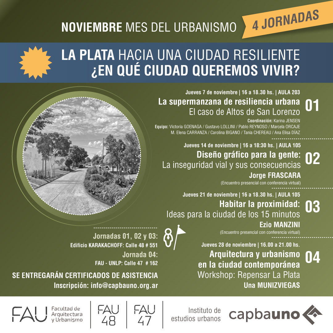 En el marco de la celebración del 75° aniversario del Día del Urbanismo –instituido por la Organización de Naciones Unidas, en noviembre pasado y con la organización del IEU -Instituto de Estudios Urbanos- del CAPBAUNO, se desarrolló el ciclo ¿EN QUÉ CIUDAD QUEREMOS VIVIR? / LA PLATA HACIA UNA CIUDAD